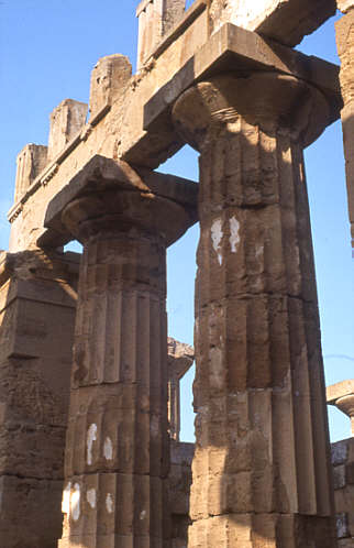 Säulenpaar des Opisthodoms. Links das wieder errichtete Stück der Antenmauer.