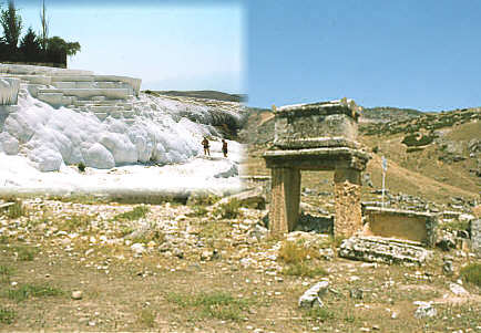 Bei der antiken Stadt liegen die Sinterterassen von Pamukkale (deutsch: Baumwollschloss), die durch die Aussinterung des im Wasser der warmen Quellen gelösten Kalziumoxyds bei der Berührung mit dem Luftsauerstoff entstehen. |