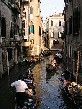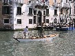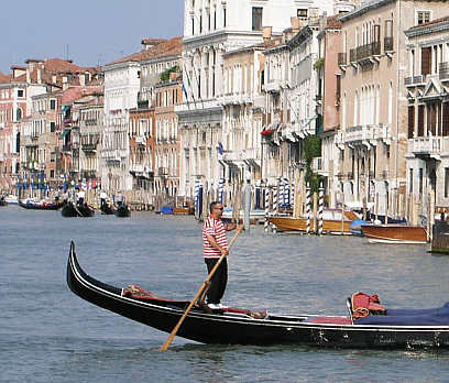 Gondelfahrt auf dem Canale Grande. Die Gondolieri touristengerecht fotogen mit gestreiften Hemden.