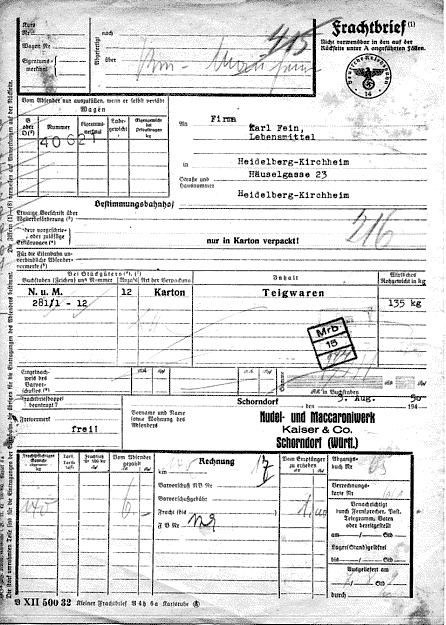 Frachtbrief der Bahn Schorndorf - Heidelberg, 3.8.1950