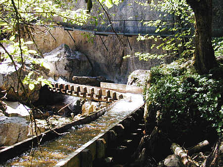 Wasserzulauf in einem hölzernen Kanal, der das Wasser der Pöllat aufnimmt.