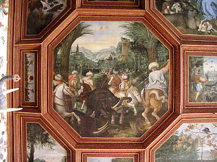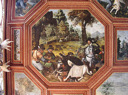 Die Decke ist am Dachgebälk abgehängt, was eine große Spannweite ermöglichte. In den großen sechseckigen Feldern sind Szenen der Großwildjagd dargestellt, die mit den Stuckfiguren an den Wänden korrespondieren. Die kleinen rechteckigen Felder zeigen Szenen der Jagd auf Niederwild.