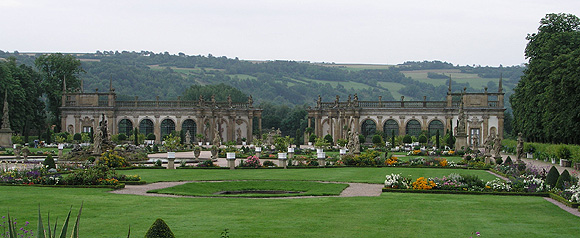 Die Orangerie von J. Chr. Lüttich am südlichen Ende des Gartens besteht aus zwei Flügeln die sich in der Mitte zu einem Halbrund öffnen. Sie war gleichermaßen Unterkunft für die empfindlichen exotischen Pflanzen als auch Belvedere, hoch gelegene Aussichtsplattform für die Hofgesellschaft. Die Öffnung der Orangerie in der Mitte gab den Blick in die Landschaft frei.