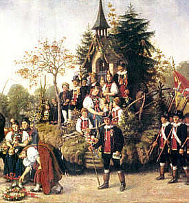 Der dritte Wagen war wie eine Kapelle gebaut, und das Goldene Hochzeitspaar saß davor, von Kindern und Enkeln umgeben. |