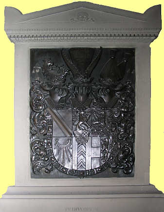 Epitaph in der Stiftskirche Baden-Baden Bronzener Wappenschild mit dem sechsteiligen badischen Wappen und dem badisch-sponheimischen Wappen im Herzschild.
