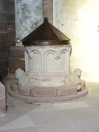 Taufstein mit Blendarkatur außen, auf drei Figuren ruhend: