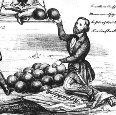 Friedrich Hecker kniet auf der Fahne der Republik und beschwert die Waagschale mit dem Parlament zusätzlich mit Kanonenkugeln, da nur sie allein der Sache der Revolution das nötige Gewicht geben können. |