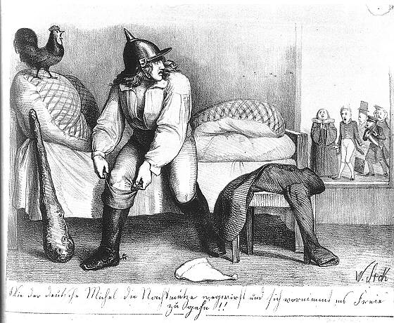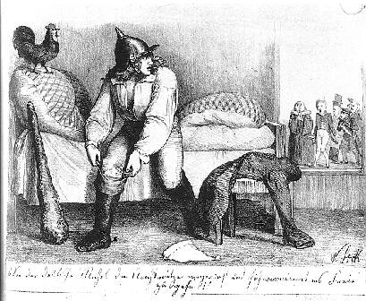 der deutsche Michel seine Nachtmütze wegwirft und sich