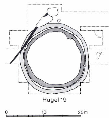 Fundsituation der Hügelgräber im Oppidum Heidengraben: Grab 19 mit zwei konzentrischen Kreisgräben, die einen älteren Hügel (dunkel) und seine Erweiterung (hell) kennzeichnen.