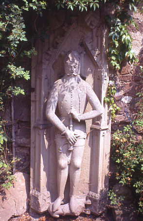 Grabfigur eines stehenden Ritters, heute an der Hofmauer aufgestellt