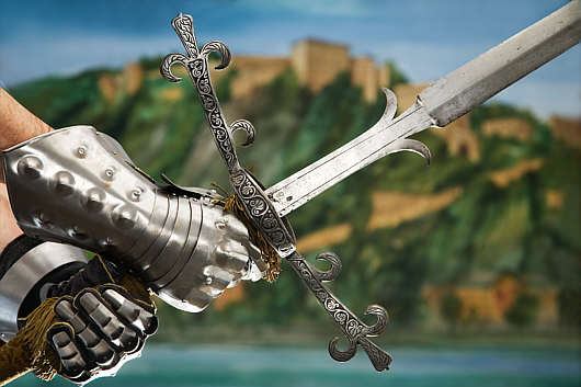 Bewaffnung ein "Ritter" Helm, Replik Helm, Visier Schwert Mantelhelm Panzerhandschuh Reiterschwert Darstellungen Objekte