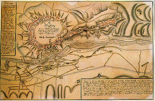 |  Rastatt, Wehrgeschichtliches Museum, Inv.-Nr. 004578. Abb. aus: Festungswesen 2 (Sammlungen des Wehrgeschichtlichen Mus.) Abb. 4 | FreiburgPlan der französischen Belagerung von 1744 im Österreichischen Erbfolgekrieg Der Plan zeigt die Zerstörungen der Kaiserbastion und die Wirkung der Belagerungsartillerie auf die Südfront des Unteren Schlosses. Nicht eingezeichnet ist die Umleitung der Dreisam im Süden der Stadt. |