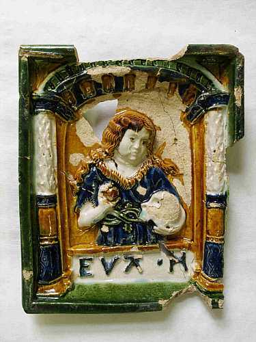 Die bunt glasierte Kachel eines Prunkofens mit der Darstellung