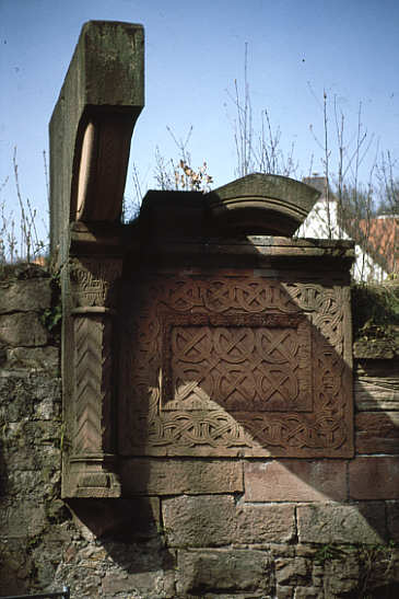 Links und unten: Kaminplatten im ehemaligen Festsaal der Pfalz (linke und rechte Seite) mit Flechtbandornament und gezackten Überfangbogen.
