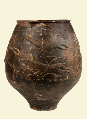 Der große Becher mit bemerkenswerter Verzierung in Barbotinetechnik (flüssiger Ton) zeigt eine Jagdszene mit zwei Hunden, die zwei Ricken und zwei Hirsche in einem Wald verfolgen.