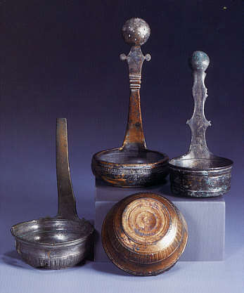 Der Stiel der Kelle in der Mitte hinten endet in einem runden Sieblöffel, die beiden Rundeln links und rechts sind mit Kreisaugen verziert.