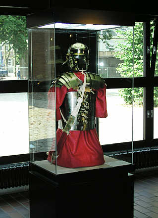 Die Rüstung besteht aus dem Brustpanzer, den Schulterstücken und einem Helm mit Wangenschutz und wird über einer Tunika getragen. Zur Bewaffnung gehört das Kurzschwert. Lanze und Schild sind nicht mit abgebildet.
