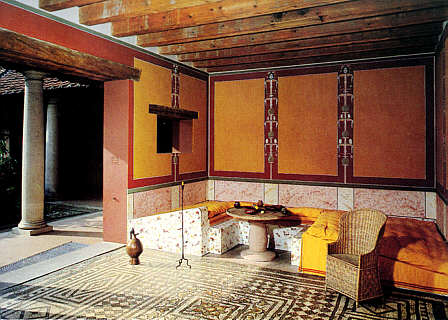 Steinerne Bänke mit Polstern umgeben einen Tisch. Die Römer lagen zum Essen, weswegen sie nur eine Hand für das Besteck frei hatten.