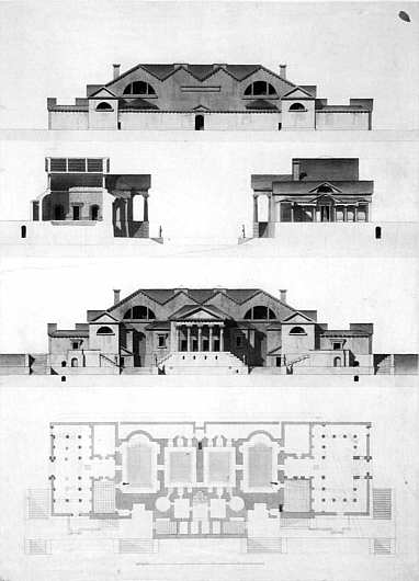Nord- und Südansicht, Querschnitte und Grundriss, 1812/22 Bleistift,