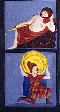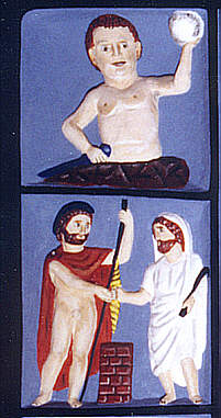 Oben die Felsgeburt des Mithras Unten überreicht Saturn im Mantel und mit verhülltem Haupt Jupiter über einem Altar den Donnerkeil |