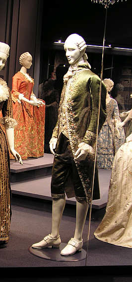 Herenanzug, sog. "Habit a la française", bestehend aus Kniehosen ("Culottes"), Weste und knielangem Rock (Jacke, "justaucorps").