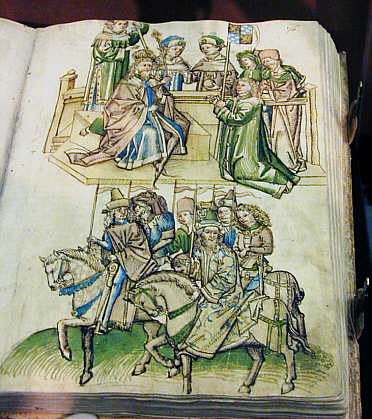 Belehnung Pfalzgraf Ludwigs III. beim Konstanzer KonzilBelehnung des Pfalzgrafen Chronik des Ulrich von Richental, Konstanzer Exemplar, S. 75v Der Pfalzgraf kniet vor König Sigismund und empfängt eine Fahne als Zeichen der ihm übertragenen Reichslehen. Hinter dem König steht ein Mann, der ein Schwert über ihn hält, es symbolisiert das Schwert der Weisheit, unter dem den König handelt. |