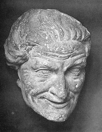 Fragment eines Kopfes Kalkstein, Straßburg, um 1460-70 Außerordentlich fesselnde und realitätsnahe Arbeit, deren Zuordnung zu einer Figur unbekannt ist. Zugespitzter mimischer Ausdruck, der durch die Falten des alternden Gesichts unterstrichen wird. |