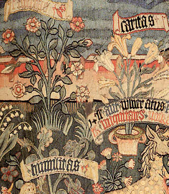 Detail aus dem Wandbehang "Hortus conclusus", Rose für die Keuschheit, Lilie für die Nächstenliebe, Veilchen für die Demut |