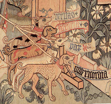 Detail aus dem Wandbehang "Hortus conclusus", Sie verkörpern die christlichen Tugenden: Wahrheit, Gerechtigkeit, Friedfertigkeit und Barmherzigkeit |