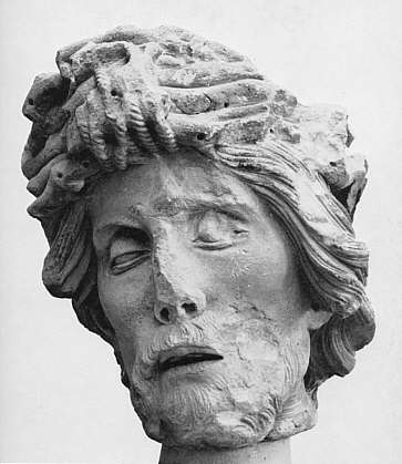 Fragment von einem Kruzifix, Tiefliegende, gerade brechende Augen, eingefallene Wangen und ein vorgeschobener Mund verdeutlichen das Leiden Christi. |