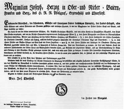 Abtretungserklärung Herzog Maximilians von Bayern für die rechtsrheinischen Gebiete der Kurpfalz an Baden, Hessen und Nassau.