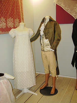 Empirekleid, um 1805, und Herrenanzug (Habit dégagé), um 1795