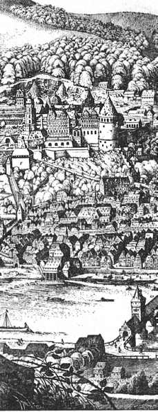 Gründung der Stadt Heidelberg neben dem alten Burgweiler zusammen mit Schloss-Neubau auf der Terrasse unmittelbar über der Stadt am Beginn des 13. Jahrhunderts (Architekturfragmente).