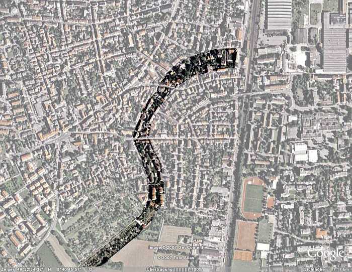 | Kirchheim Satellitenbild des Ortskerns (© Google Earth 2007)Hervorgehoben ist der Zuig des alten Neckarlaufs, der sich