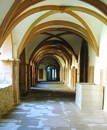 die die Abtei schon früh mit nicht geringen Kosten erbaute. Bild: Blick aus dem Kreuzgarten auf den südlichen Kreuzgangflügel
