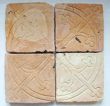 Flechtbandmuster, in Vierergruppen zu kreisförmigen Ornamenten zusammengelegt. Seitenlänge 12,5 bis 14,5 cm.