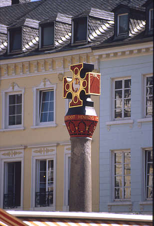 Als Hoheitszeichen des Erzbischofs als Stadtherr im 10. Jahrhundert aufgestellt. Es trägt auf der Vorderseite das Kreuzlamm und auf der linken Seite die Figur des heiligen Petrus als Hoheitszeichen des Erzbischofs.