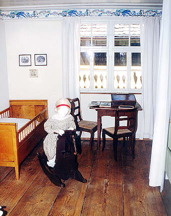 Das Mädchen in der Bildmitte auf einem Schaukelpferd ("Gampiross", um 1840), daneben ein Kinderbett (Kirschbaum, Biedermeier). Vor dem Fenster Kindertisch und Kinderstühlchen (Biedermeier).