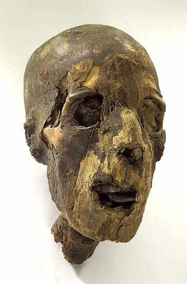 ist. Im Gesichtsbereich sind noch Reste der ehemaligen Bandagierung