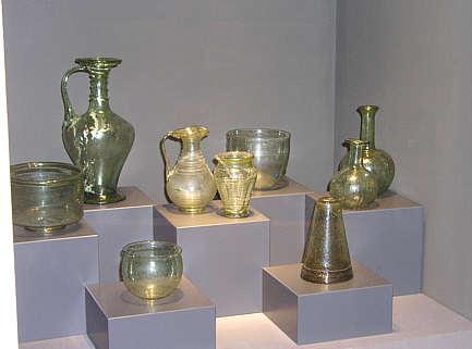 Olivgrünes Glas des 4./ 5. Jahrhunderts, vor allem als Tringeschirr für Wein, meist aus Grabbeigaben. Der Sturzbecher im Vordergrund konnte nicht abgestellt werden, bevor er nciht leer war.