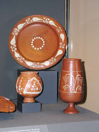 Barbotinetechnik Zweifarbige Dekore: Weiße Muster auf rotem Grund