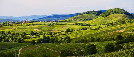 aus den bekannten Weinlagen »Schäf« und »Letten« ein.  Blick über Auggen und die umliegenden Rebberge. © Werbegemeinschaft
