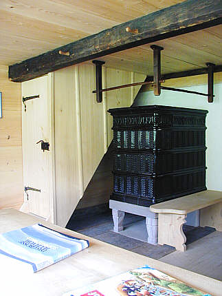 und durch einen großen Kachelofen in der Ecke beheizt. Dieser hat
