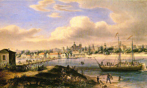 Mannheim, Schiffbrücke um 1835Mannheim, vom linken Rheinufer aus gesehen, um 1835. Links im Vordergrund die Mannheimer Rheinschanze, das heutige Ludwigshafen. Kolorierte Lithografie, 25,5 x 44 cm, um 1835. Mannheim, Reiss-Museum |