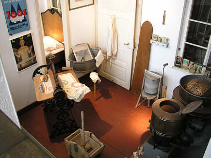 "Waschtag" ineiner Zweizimmerwohnung, mit Waschzuber,