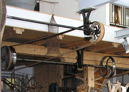 Transmissionsanlage in der Weberei Störr Die vom Wasserrad erzeugte Drehenergie wurde über feststehende Wellen auf Scheiben geleitet und mit Lederriemen auf andere Wellen umgeleitet.