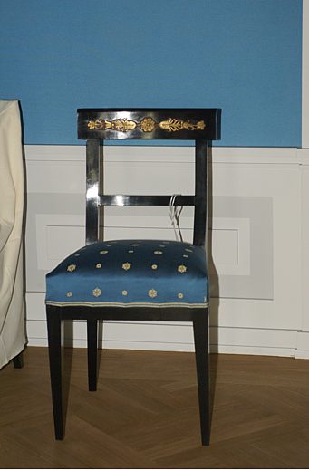 Einer der Empire-Stühle aus dem Apartement der Großherzogin Stéphanie: Schwarz lackiertes Holz mit blauem Bezug