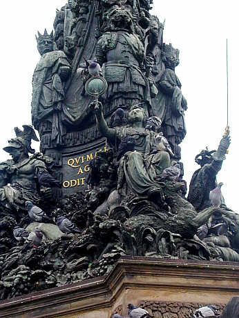 Grupello-Brunnen auf dem Paradeplatz Der Pyramiden-Aufbau Figur der Prudentia (Weisheit) mit der Inschrift "QVI MALE AGIT, ODET LUCEM" (Wer Böses tut, hasst das Licht). Sie trägt in der erhobenen Rechten den Spiegel der Selbsterkenntnis, mit der Linken umklammert sie eine Schlange. Ihr zu Füßen ein Rehbock. |