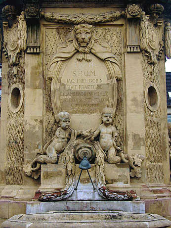 darunter zwei Putten mit einem Ferkel und dem Namen des Neckars auf dem Brunnenausfluss