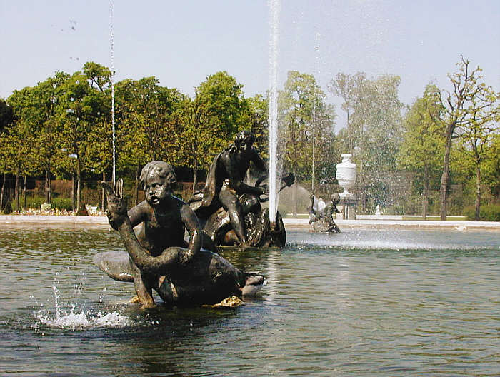 Brunnen im Zentrum des französischen Gartenparterres mit